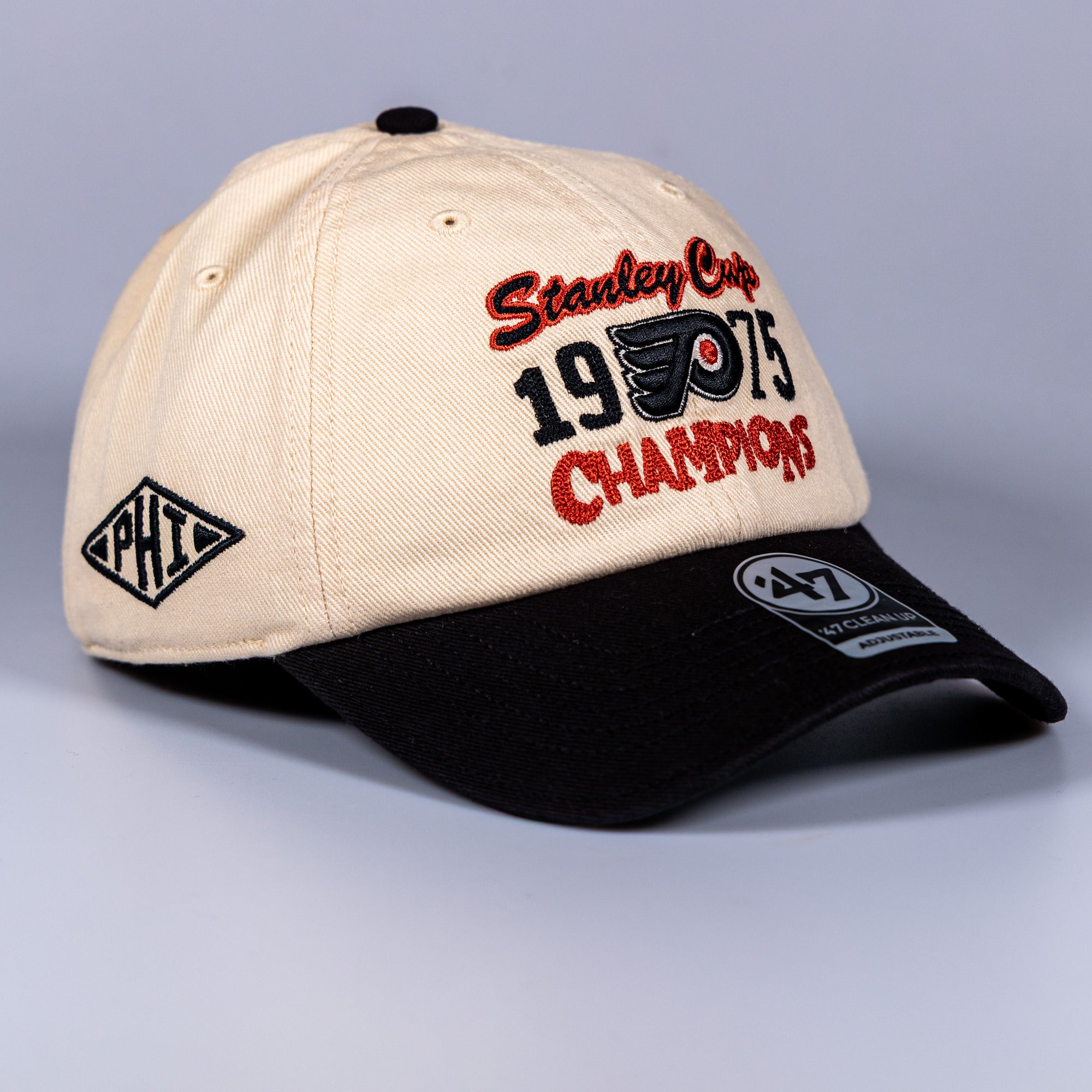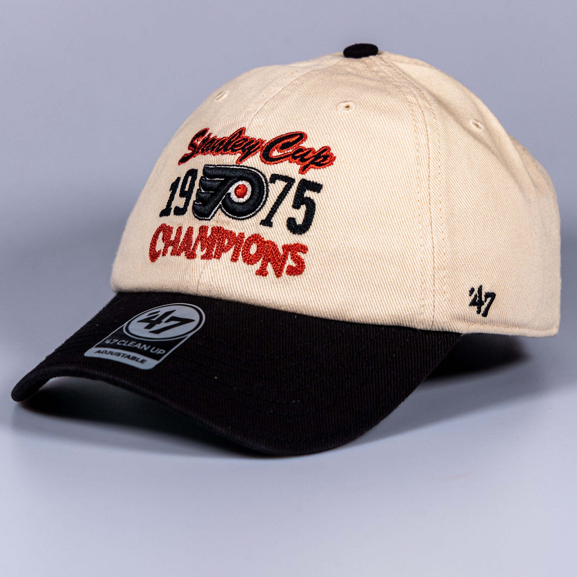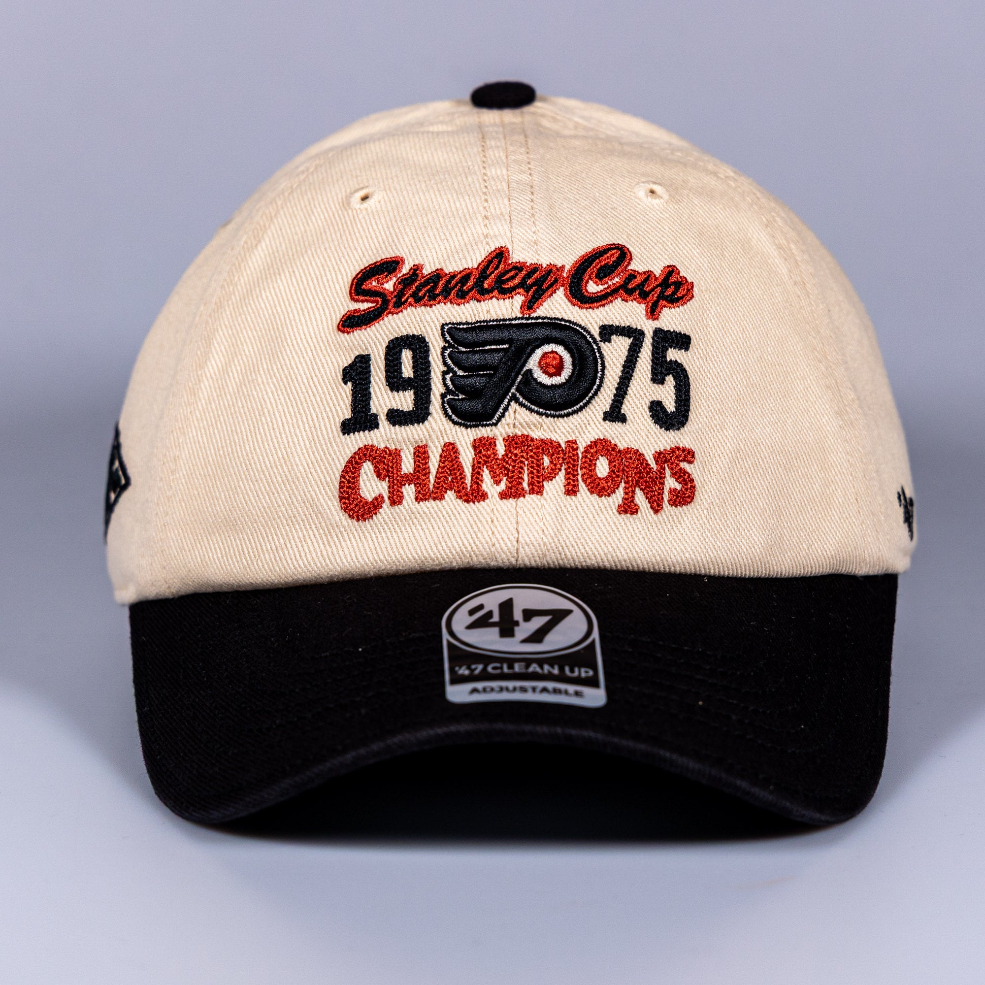 This lid celebrates the Flyers’ 1975 Stanley Cup victory, when finesse took a back seat and brute force ran the league. The cream crown keeps it clean, while the black curved peak adds bite. Front and centre, bold embroidery shouts Stanley Cup 1975 Champions, finished with the iconic Flyers logo — no subtlety, no apologies.
