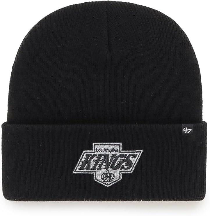 Stay warm while representing your team with the Los Angeles Kings Haymaker Cuff Knit by ’47 Brand. This sleek, all-black beanie features a classic cuffed design made from soft, stretchable knit fabric that provides reliable warmth and comfort. The front cuff showcases a sharp embroidered Kings logo in silver and white, giving the beanie a bold yet clean look. Perfect for cold games, winter outings, or everyday wear, this Haymaker Cuff Knit is a must-have accessory for any dedicated Kings fan.