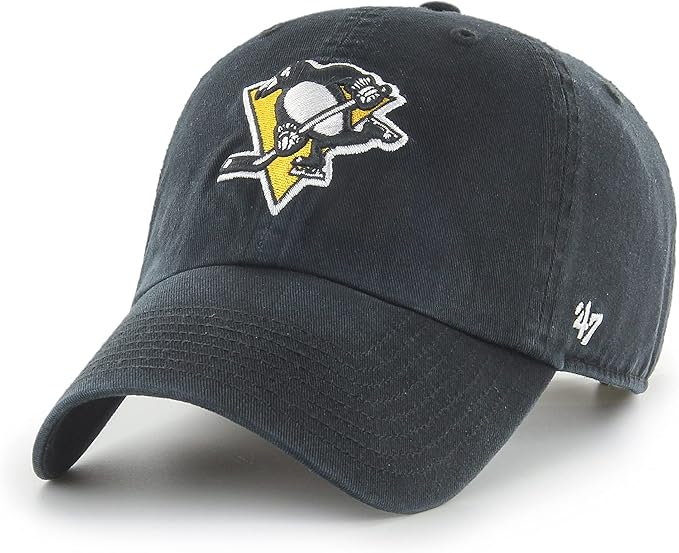 Show your Penguins pride with the Pittsburgh Penguins ’47 Clean Up Cap. This classic dad-hat style features a relaxed, unstructured crown and a curved visor for an easy, comfortable fit. Made from soft, garment-washed black cotton, it offers a broken-in feel right from the first wear. The front proudly displays the embroidered Penguins logo in bold team colors, giving the cap a standout yet timeless look. With an adjustable strap for a customized fit, this Clean Up cap is perfect for game days, casual outings, or everyday fan style.