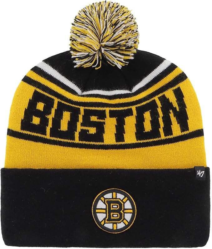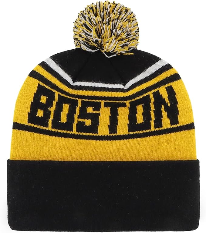 Stay warm in bold Bruins style with the Boston Bruins Stylus Knit by ’47 Brand. This eye-catching winter beanie features a classic black cuff paired with a vibrant gold body that proudly displays “BOSTON” in a retro block knit pattern. The front cuff showcases the iconic embroidered Bruins spoked-B logo, while the multi-color pom on top adds a fun, spirited finishing touch. Made from soft, stretchable knit fabric, the Stylus Knit offers dependable warmth and a comfortable fit—perfect for game nights, winter outings, or showing your Bruins pride all season long.