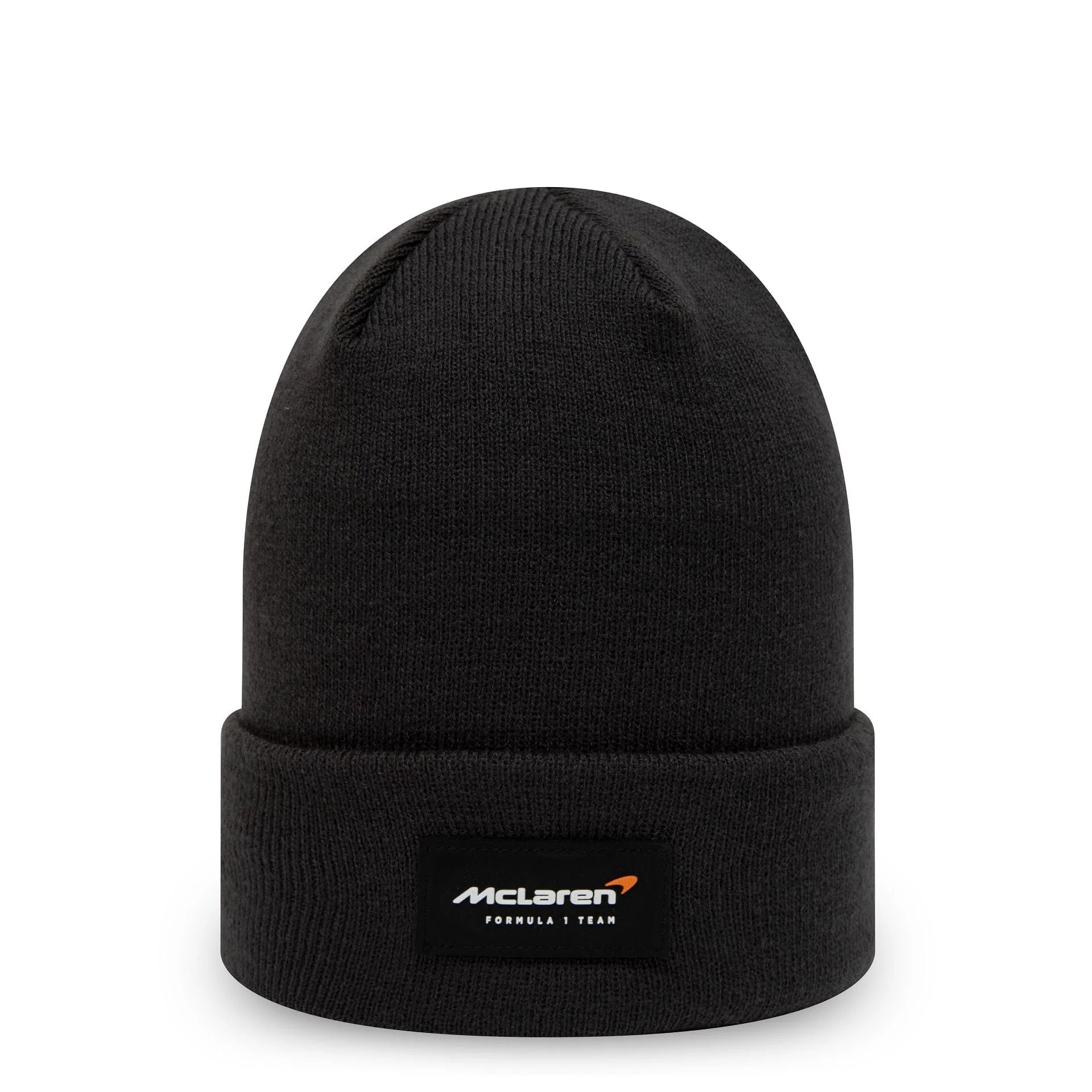 Stay warm while repping your team in the McLaren Racing Black Cuff Knit Beanie Hat by New Era. Designed for both comfort and style, this soft knit beanie features a classic fold-over cuff and a sleek black finish. The front proudly displays the McLaren Formula 1 Team logo patch, adding a subtle motorsport edge to your cold-weather look. Perfect for race days, winter outings, or casual everyday wear.