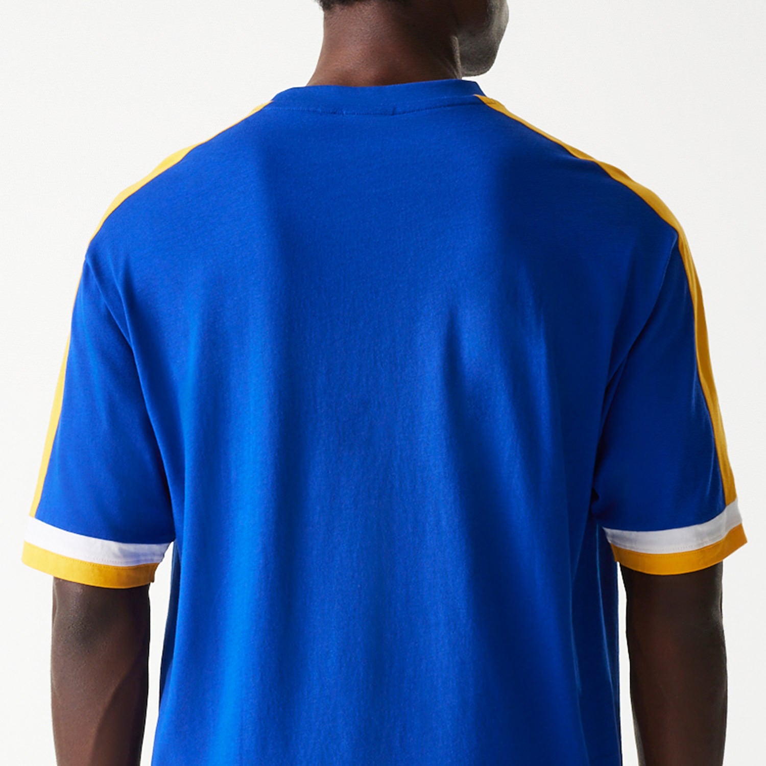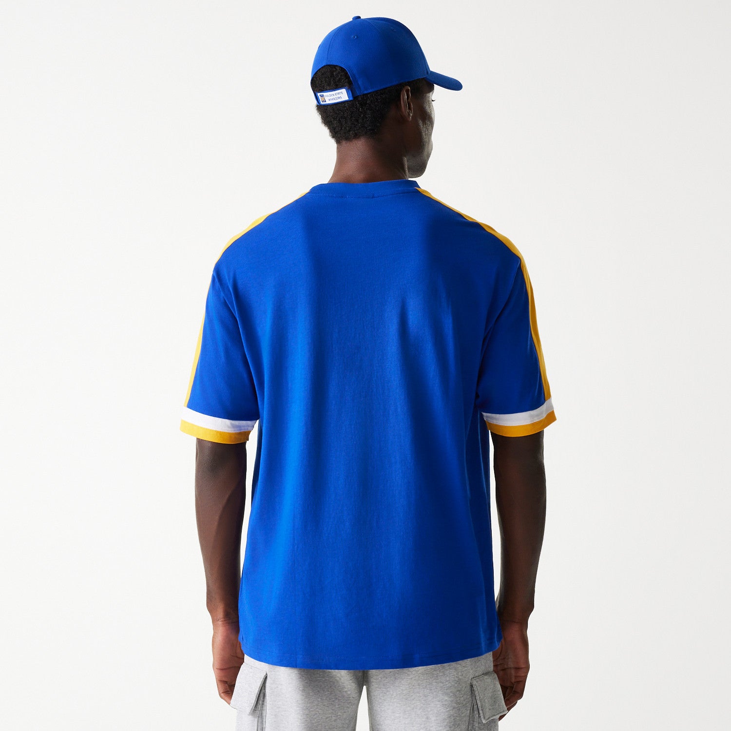 Crafted from soft, breathable fabric, it features a comfortable regular fit with a classic crew neckline. The front showcases the iconic Golden State Warriors logo and wordmark, while contrast panel detailing on the sleeves adds a sporty finish. A subtle New Era flag logo completes the design with a premium touch.